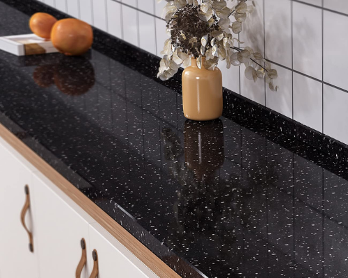 Black Galaxy granite is a popular, durable natural stone known for its deep black background with shimmering gold, bronze, or white flecks, resembling a starry night sky, making it ideal for elegant kitchen countertops, vanities, and accent walls, though its quality depends on the uniformity of the flecks and the depth of the black color.