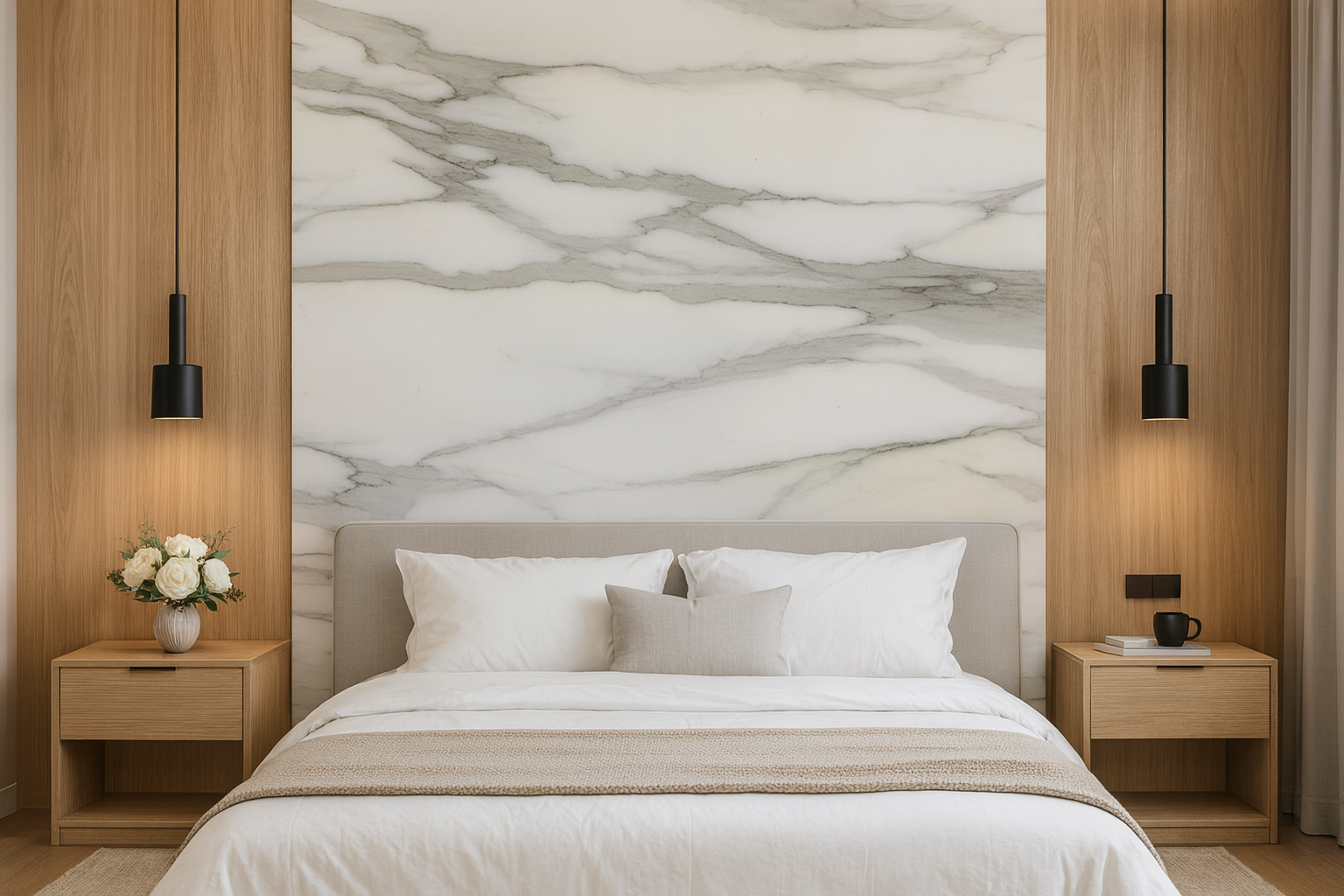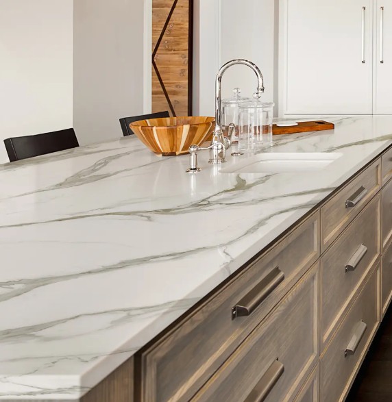 Calacatta Borghini is a prestigious Italian marble known for its creamy white background and dramatic grey and gold veining, making it a luxurious choice for countertops and other home surfaces.