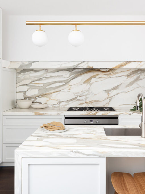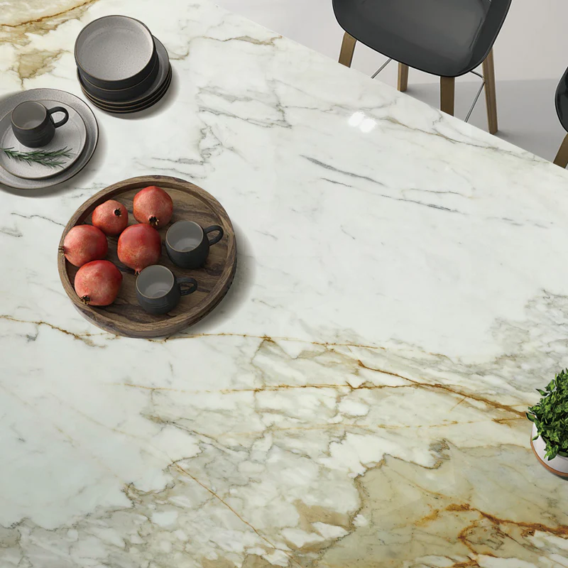 Calacatta Gold marble countertops are renowned for their striking white background adorned with bold, dramatic gold and gray veining, exuding luxury and sophistication. Sourced from Italy, this premium stone is perfect for high-end kitchens and bathrooms, adding an opulent touch to any design. Each slab features unique patterns, ensuring a one-of-a-kind appearance.