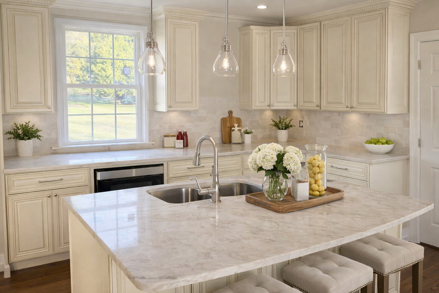 Calacatta New Taj Quartz is an engineered stone known for its creamy off-white background with delicate brown, gold, and taupe veining, offering the luxurious appearance of natural marble or quartzite with enhanced durability and low maintenance.