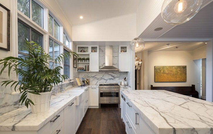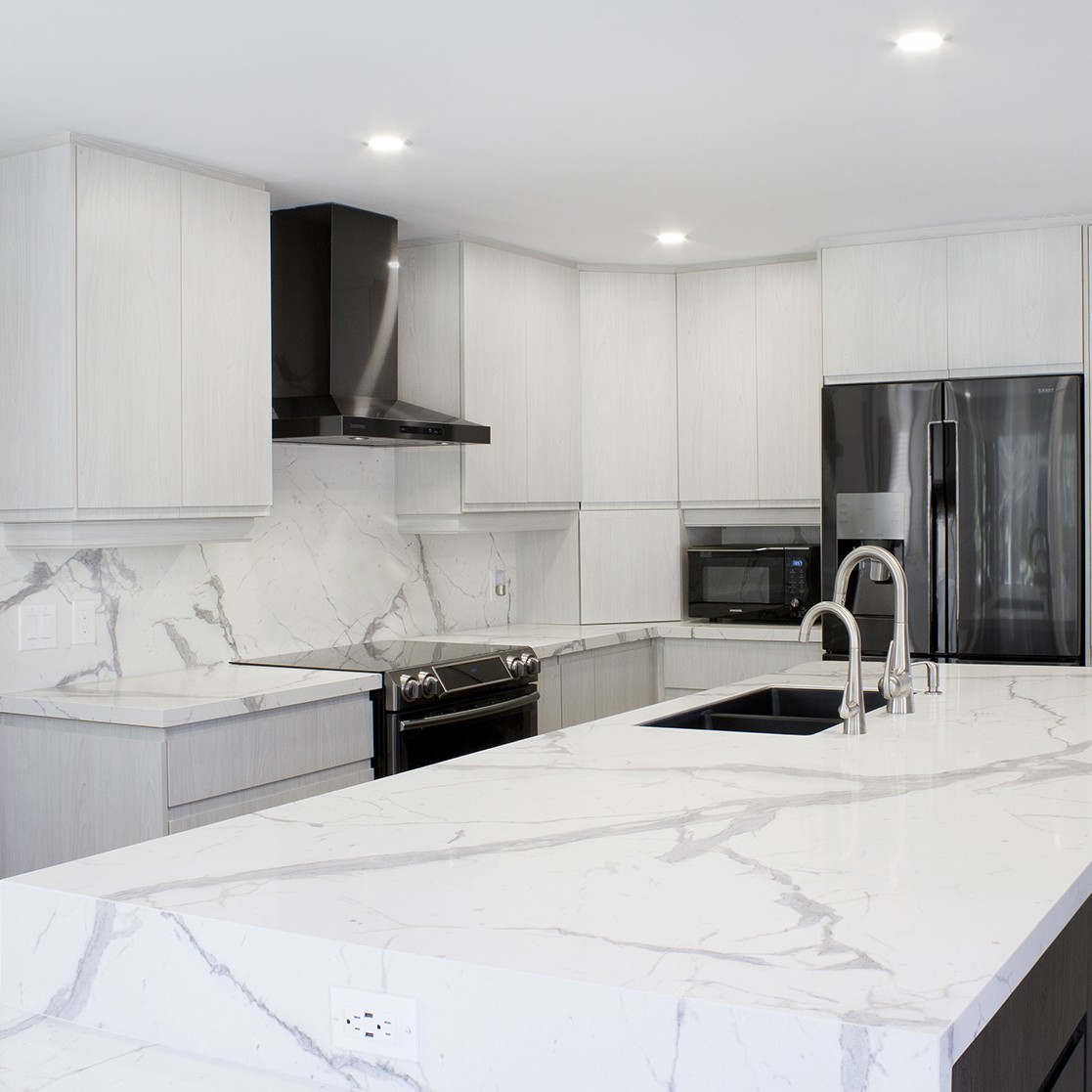 Calacatta Statuario a luxurious natural stone, often a type of Italian marble, renowned for its bright white background and elegant grey veining. It is a highly sought-after material for high-end interior applications due to its classic and opulent appearance.