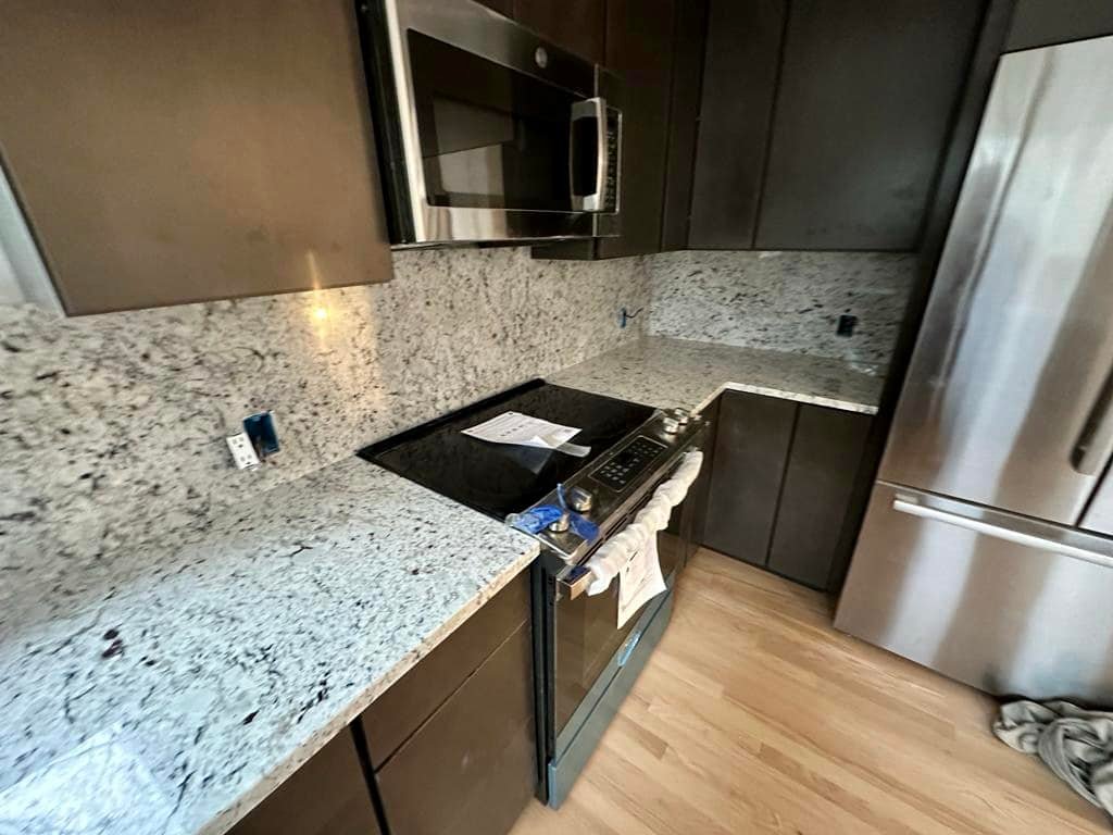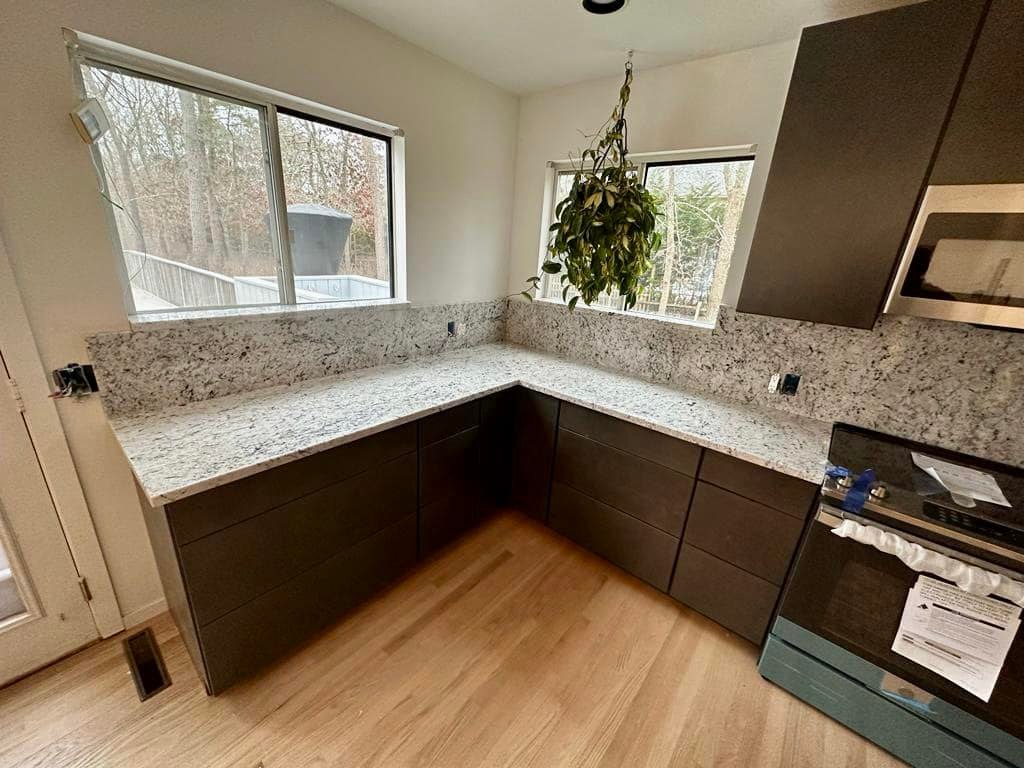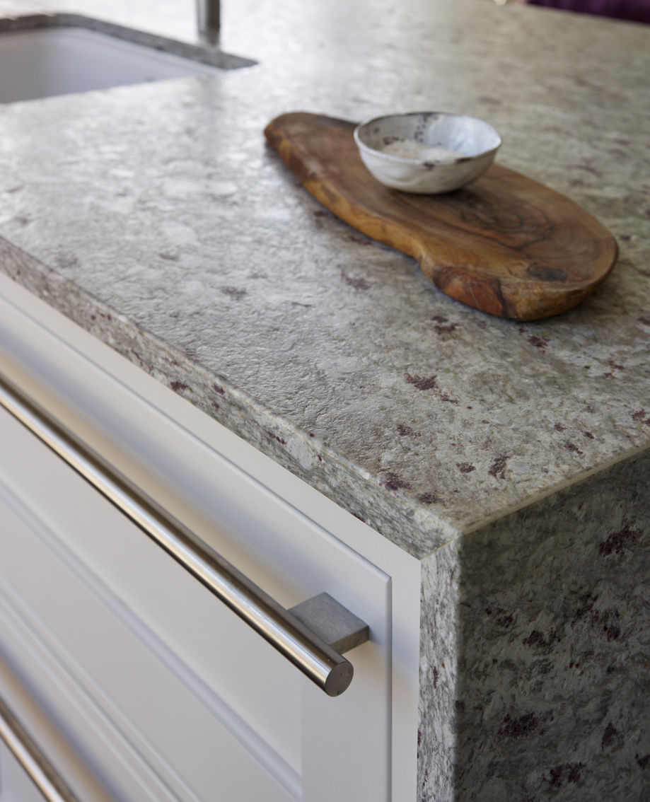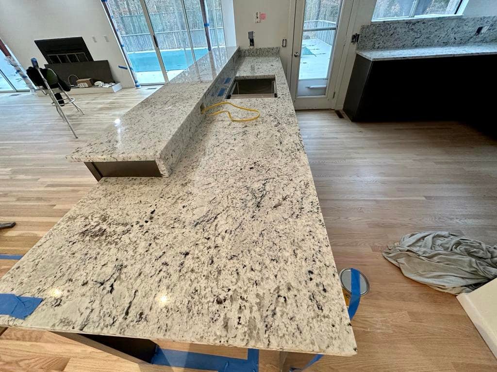 Moon White Granite, quarried in India, is a primarily white stone featuring highlights of black and silver veining, clear colored quartz specks and burgundy flecks throughout. This bright white stone is perfect for those looking for a clean, elegant look with character and pops of color. Moon White will complement any cabinet color and design style. This natural stone is a stunning choice for walls and flooring in homes as wells and businesses, and even does well in below-freezing temperatures for outdoor applications.