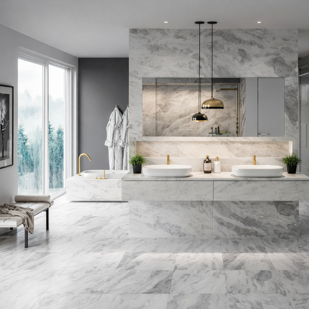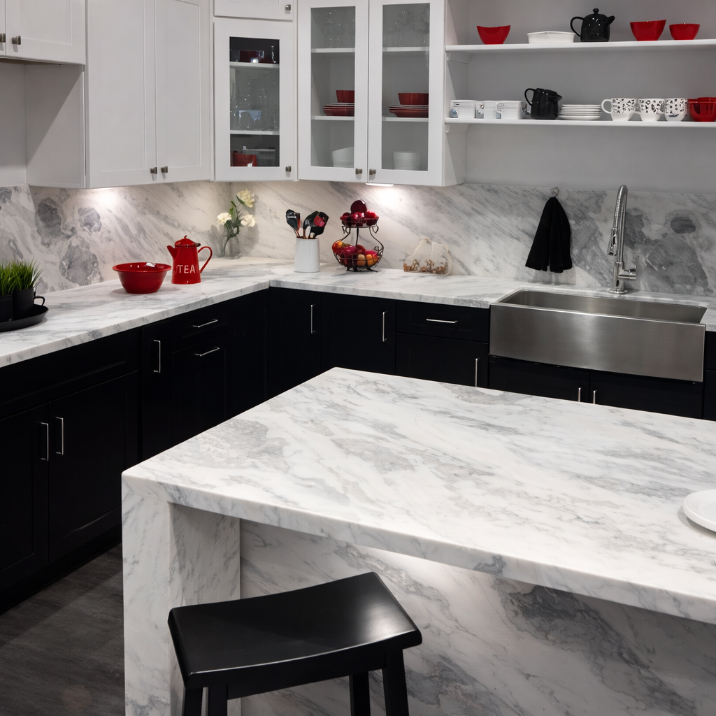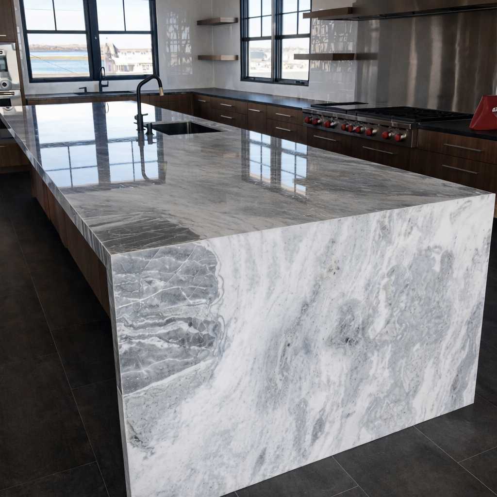 Namby Fantasy marble is a kind of white marble quarried in Namibia. This visually interesting African stone has a crisp white background with cloud like areas of light smoky grey throughout. Namby Fantasy marble is a great choice for kitchen countertops, island, bar, fireplace surround, powder room, bathroom counters, shower surrounds, tub surrounds and many other indoor applications.
