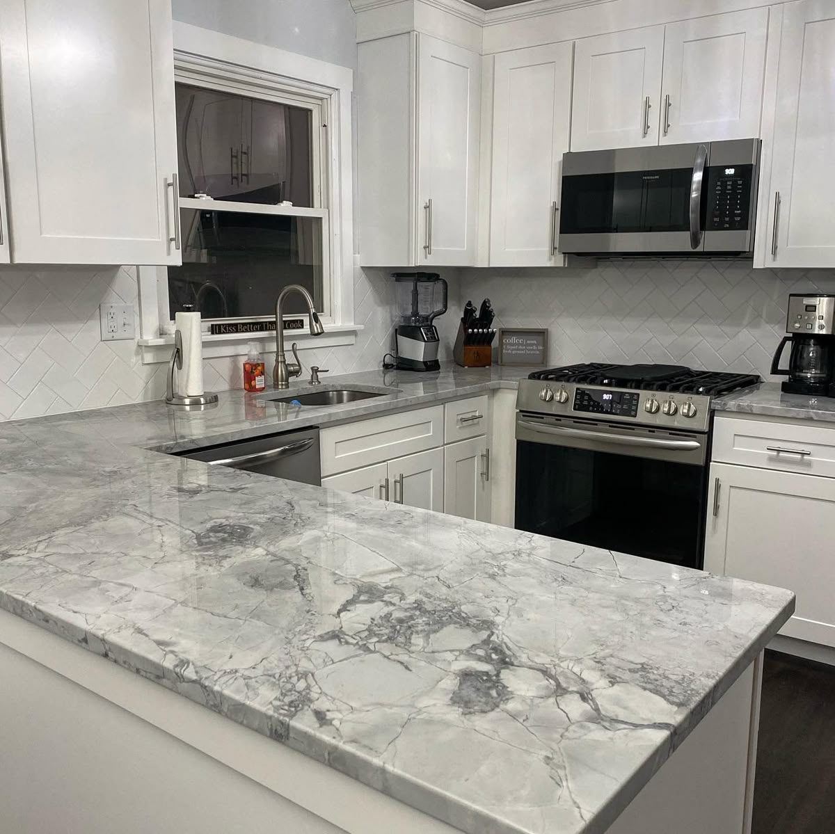 Super White quartzite is a beautiful white and gray Brazilian marble. It possesses small to intense veins in light, medium, or dark colors. Shades may vary from white to light tones of beige or gray. This natural stone is the perfect choice to create elegant marble countertops, stunning kitchen waterfall islands, breathtaking marble tile floors, and other features throughout the property.