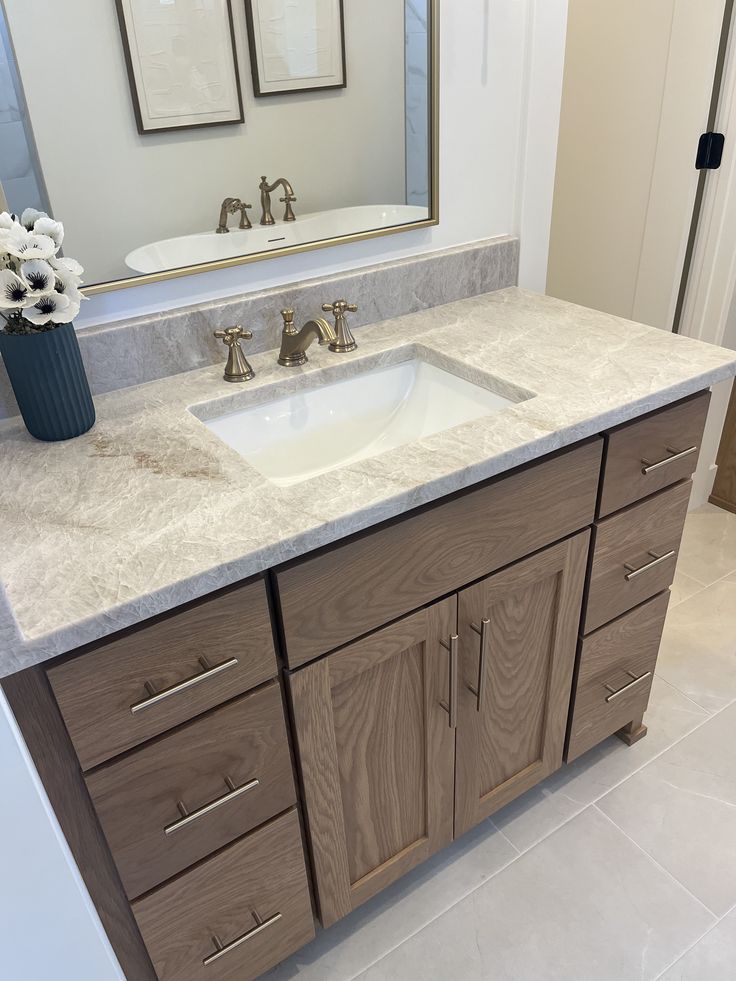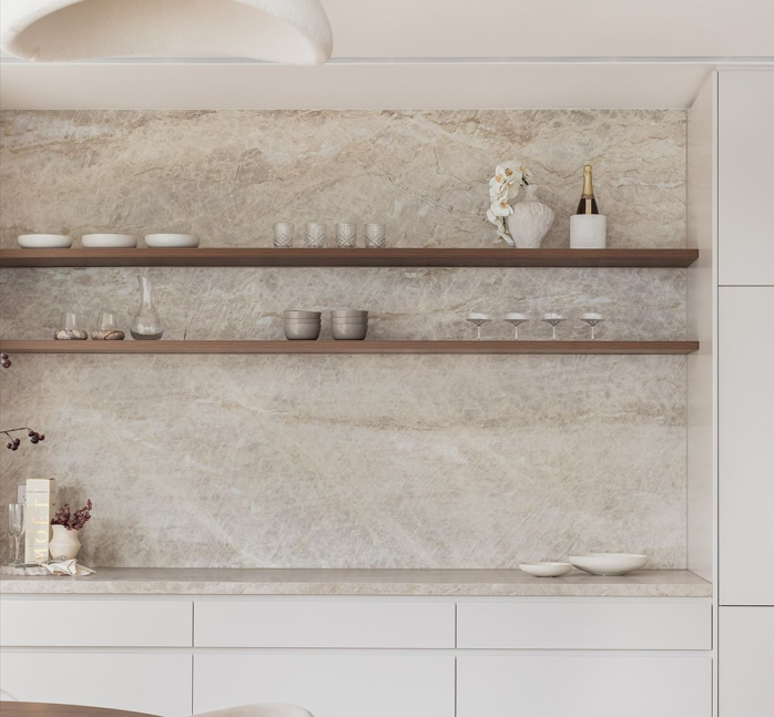 Taj Mahal quartzite comes from India and it features a soft white background and subtle gold veins along with waves of light brown. And is known for its wispy and dramatic veins like marble. This elegant natural stone is an excellent choice to create beautiful quartzite countertops, backsplash, waterfall islands, vanities and fireplaces.
