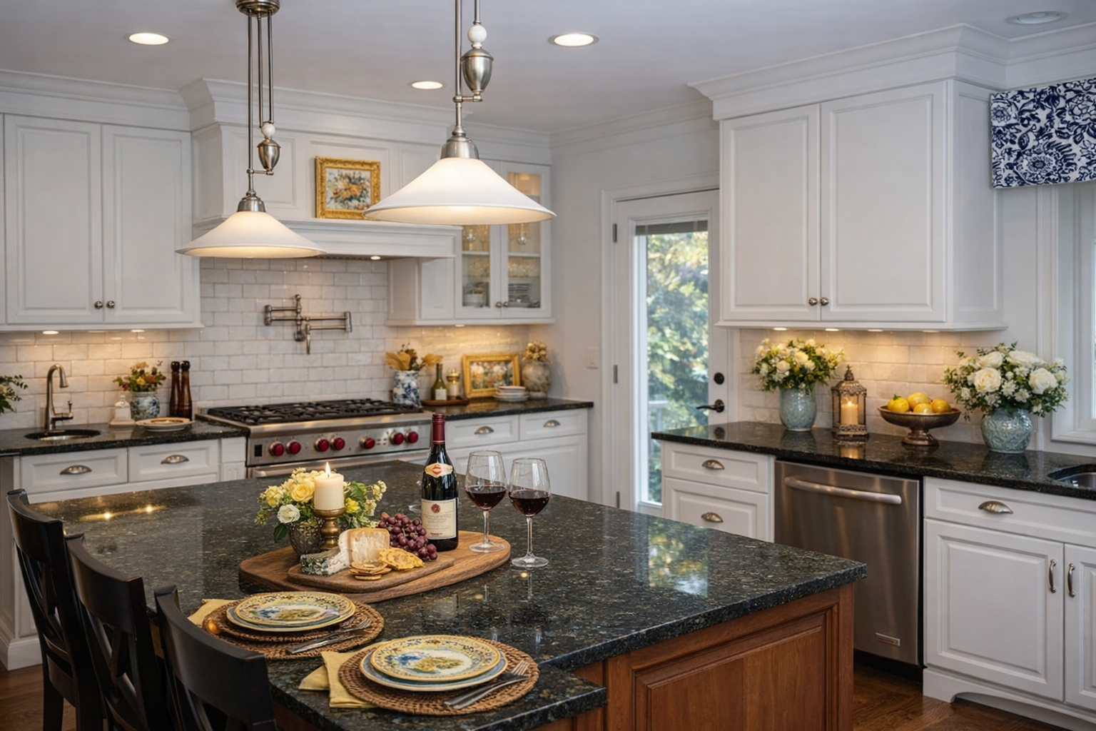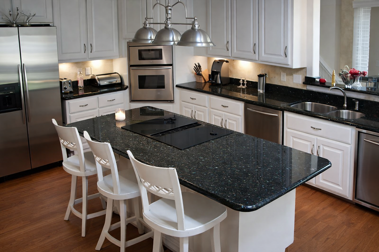 Peacock Green granite is a dark, forest-green natural stone from Brazil, known for its large blue-gray crystals and occasional gold veining. It is a durable and low-maintenance option suitable for both indoor and outdoor applications